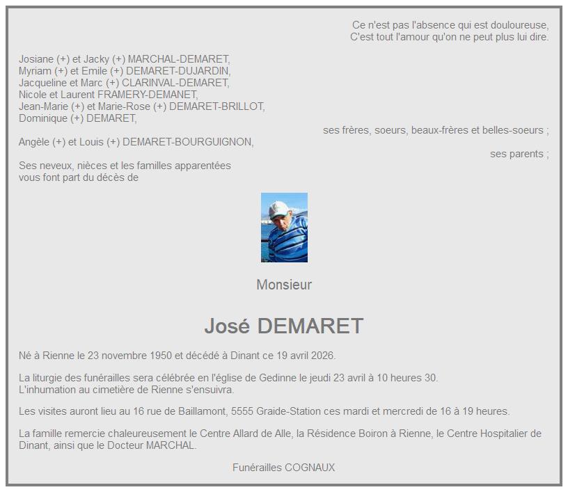 Décédé à Dinant (5500) le dimanche 19 avril 2026 à l'âge de 75 ans