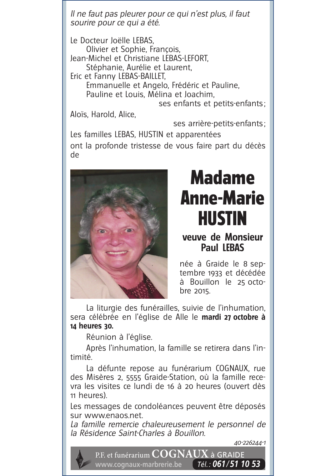 Décédée à Bouillon (6830) le dimanche 25 octobre 2015 à l'âge de 82 ans