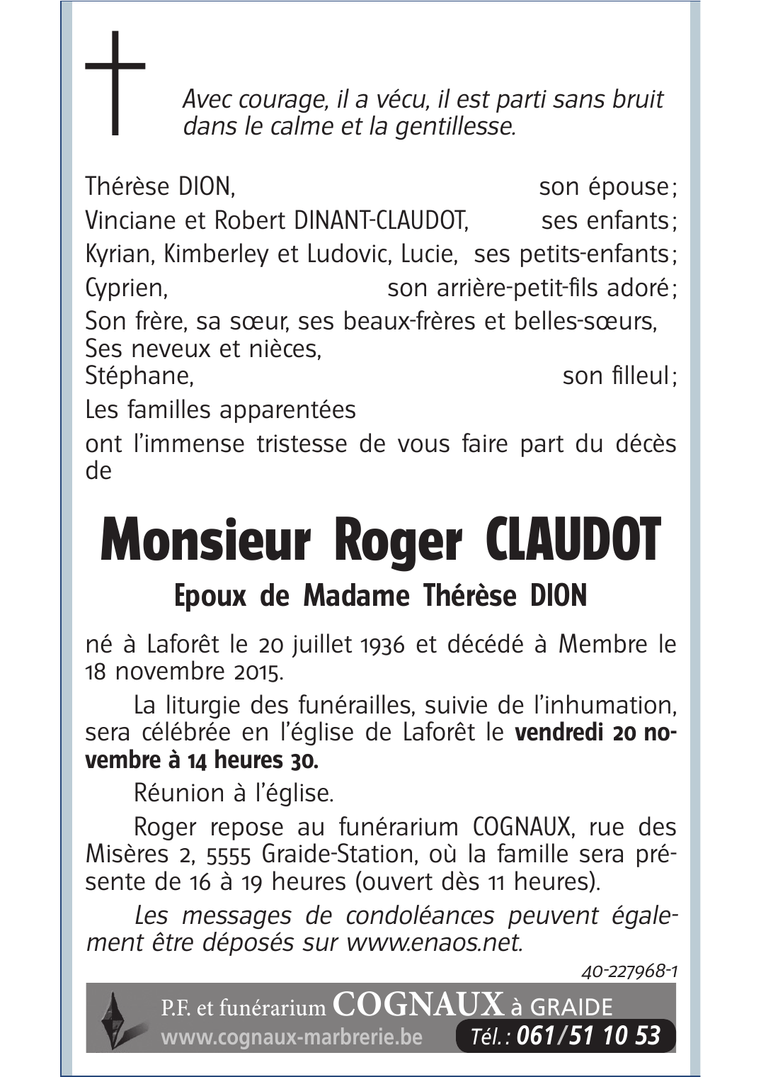 Né à Laforêt (5550) le lundi 20 juillet 1936