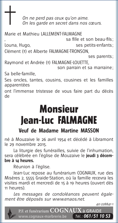 Décédé à Libramont (6800) le dimanche 29 novembre 2015 à l'âge de 61 ans