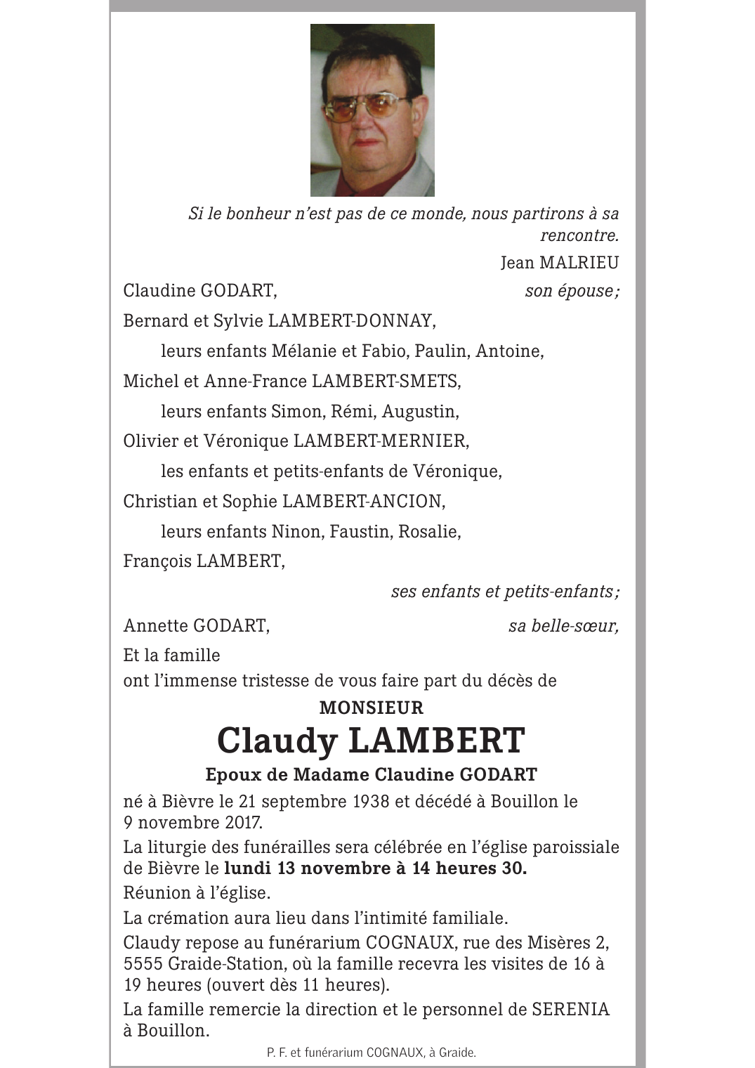 Décédé à Bouillon (6830) le jeudi 9 novembre 2017 à l'âge de 79 ans