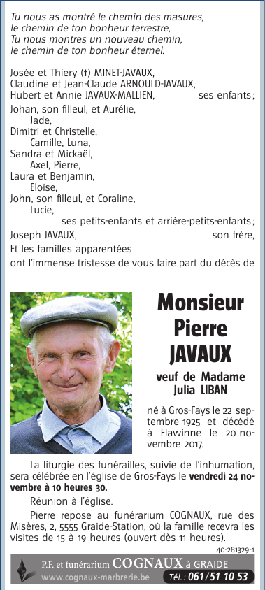Né à Gros-Fays (5555) le mardi 22 septembre 1925