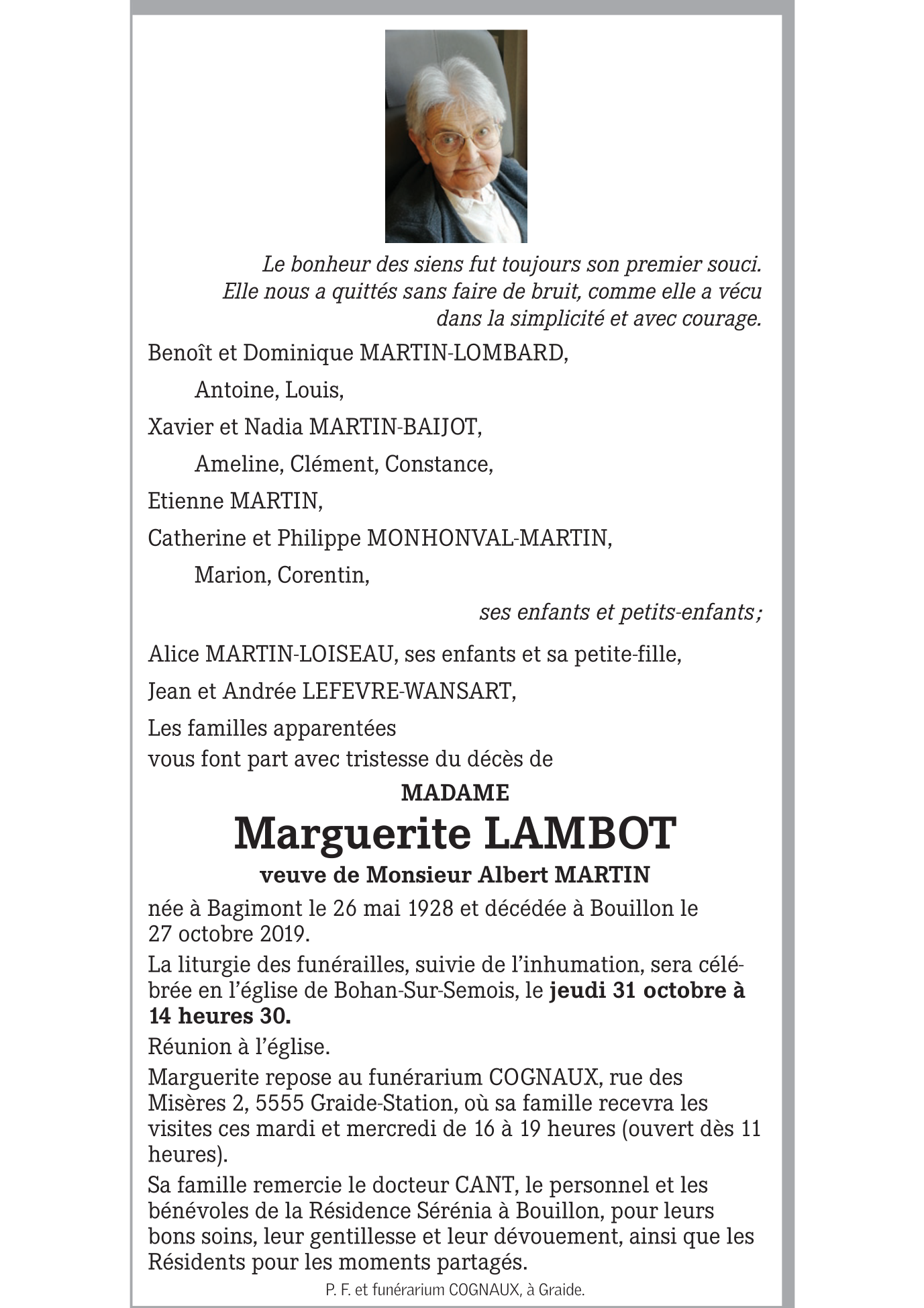 Décédée à Bouillon (6830) le dimanche 27 octobre 2019 à l'âge de 91 ans
