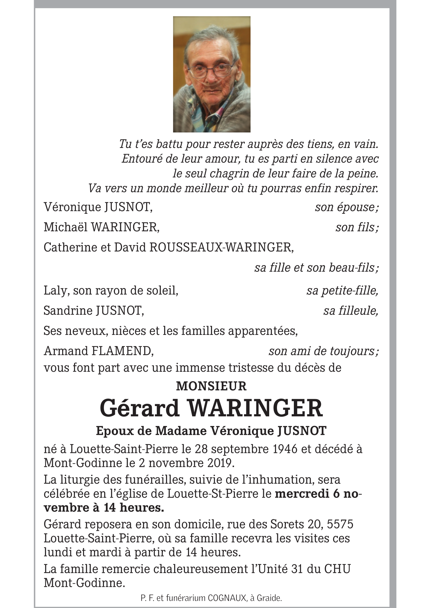 Décédé à Mont-Godinne (5530) le samedi 2 novembre 2019 à l'âge de 73 ans
