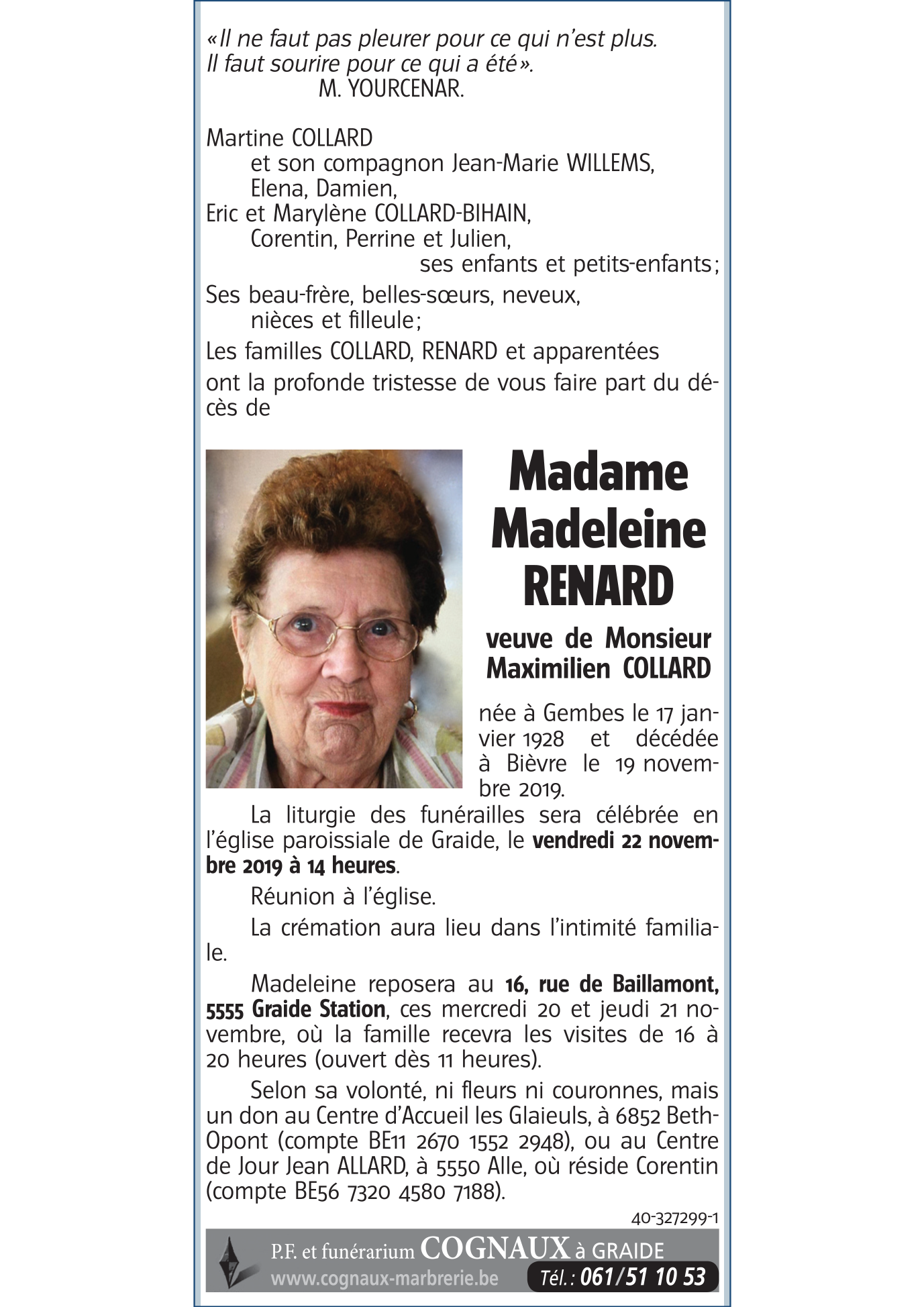 Décédée à Bievre (5555) le mardi 19 novembre 2019 à l'âge de 91 ans