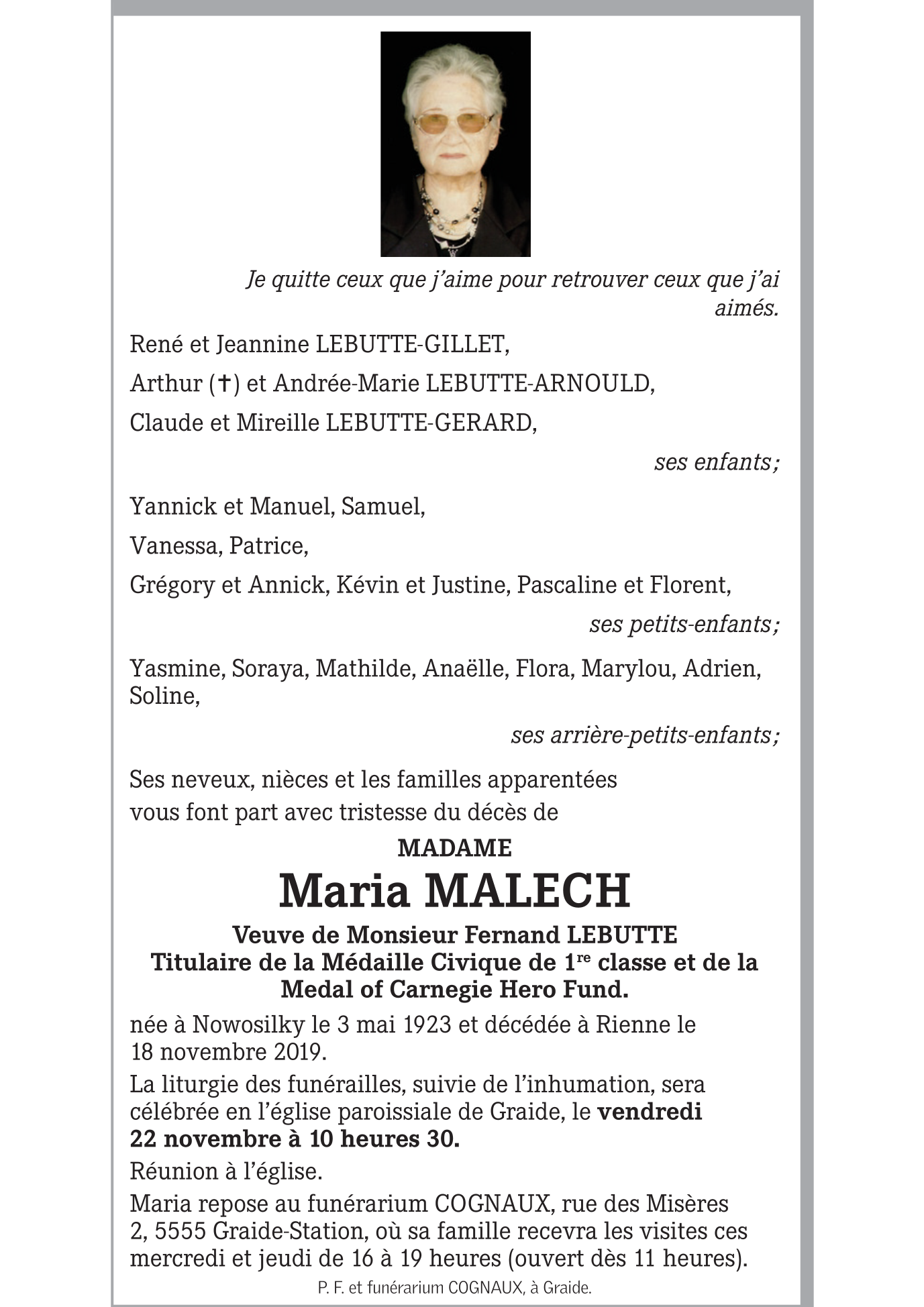 Décédée à Rienne (5575) le lundi 18 novembre 2019 à l'âge de 96 ans