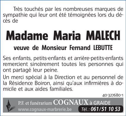 Décédée à Rienne (5575) le lundi 18 novembre 2019 à l'âge de 96 ans