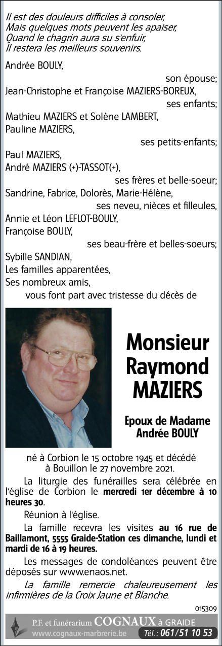Décédé à Bouillon (5370) le samedi 27 novembre 2021 à l'âge de 76 ans