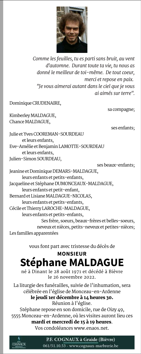 Décédé à Bievre (5555) le lundi 28 novembre 2022 à l'âge de 51 ans