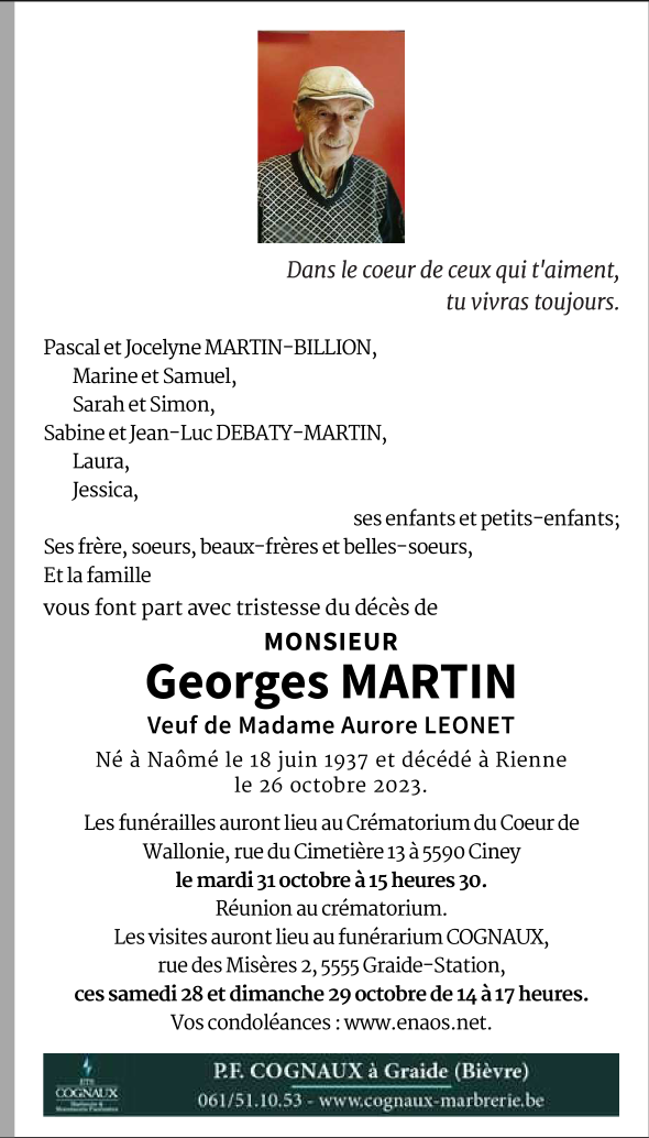 Décédé à Rienne (5575) le jeudi 26 octobre 2023 à l'âge de 86 ans