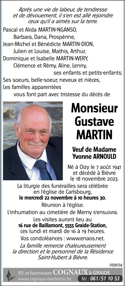 Décédé à Bievre (5555) le samedi 18 novembre 2023 à l'âge de 82 ans