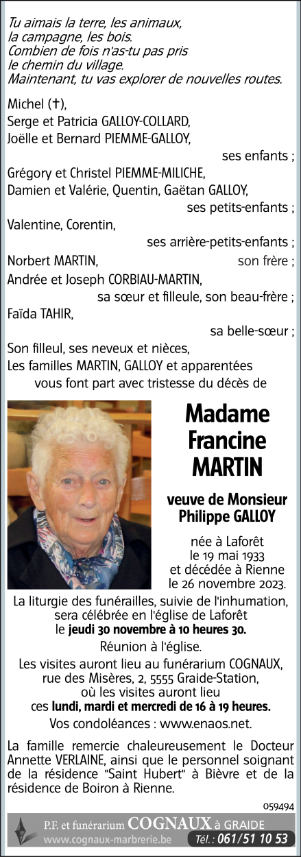 Décédée à Rienne (5575) le dimanche 26 novembre 2023 à l'âge de 90 ans
