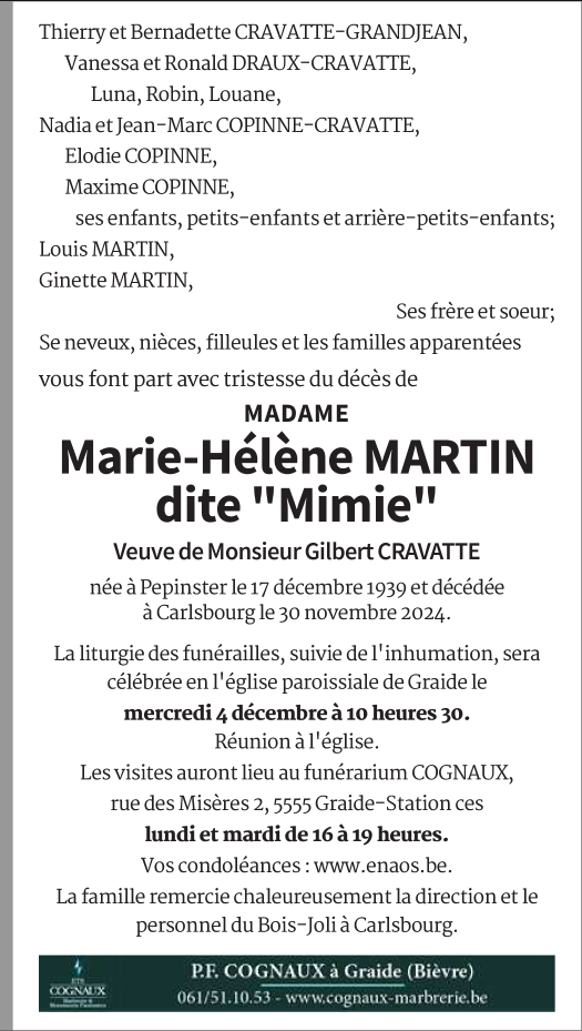 Décédée à Carlsbourg (6850) le samedi 30 novembre 2024 à l'âge de 84 ans