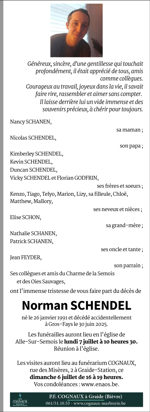 Décédé à Gros-Fays (5555) le lundi 30 juin 2025 à l'âge de 34 ans