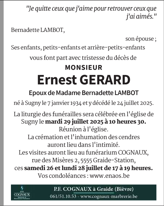Décédé à Sugny (5550) le jeudi 24 juillet 2025 à l'âge de 91 ans