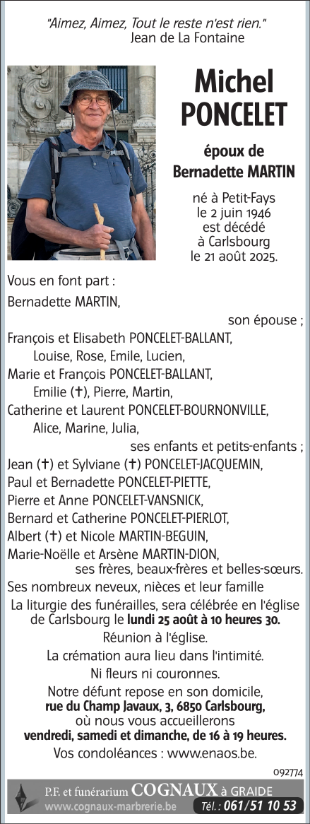 Décédé à Carlsbourg (6850) le jeudi 21 août 2025 à l'âge de 79 ans
