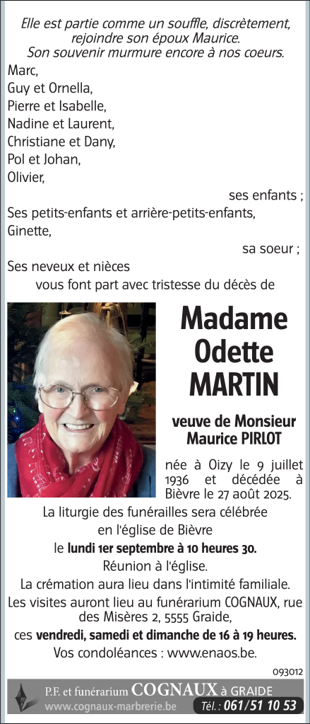 Décédée à Bievre (5555) le mercredi 27 août 2025 à l'âge de 89 ans