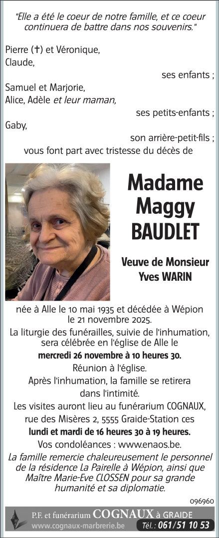 Décédée à Wépion (5100) le vendredi 21 novembre 2025 à l'âge de 90 ans