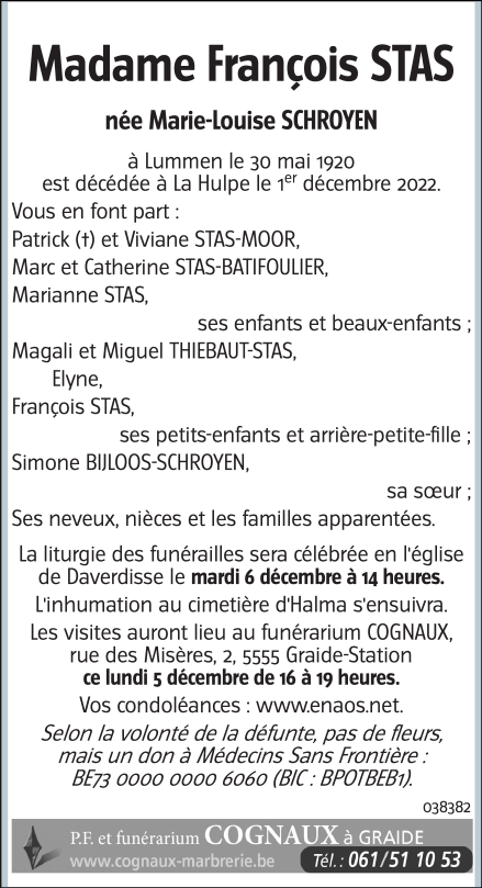 Décédée à La Hulpe (1310) le jeudi 1 décembre 2022 à l'âge de 102 ans