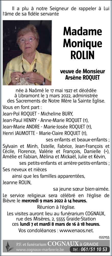Décédée à Libramont (6800) le jeudi 3 mars 2022 à l'âge de 94 ans