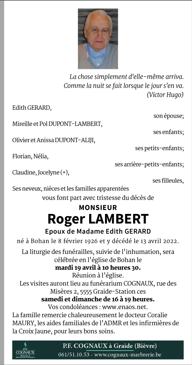Décédé à Bohan (5550) le mercredi 13 avril 2022 à l'âge de 96 ans