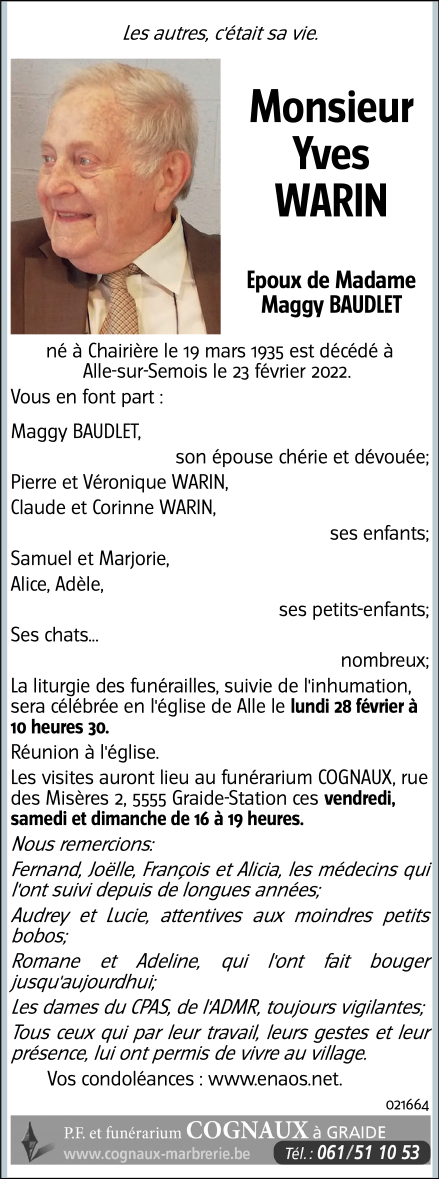 Décédé à Alle (5550) le mercredi 23 février 2022 à l'âge de 86 ans