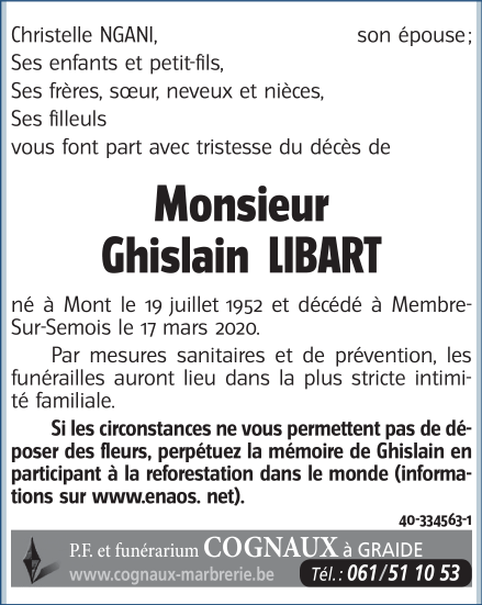 Décédé à Vresse-sur-Semois (5550) le mardi 17 mars 2020 à l'âge de 67 ans