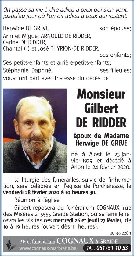 Décédé à Arlon (6700) le lundi 24 février 2020 à l'âge de 81 ans