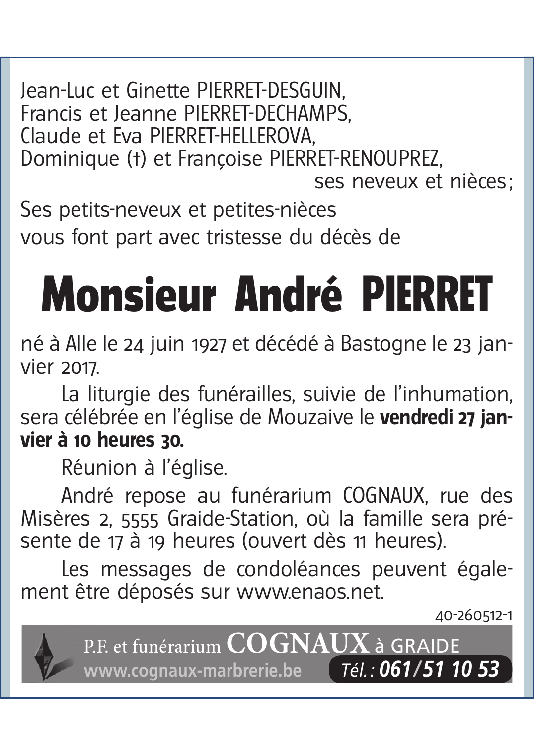 Décédé à Bastogne (6600) le lundi 23 janvier 2017 à l'âge de 89 ans