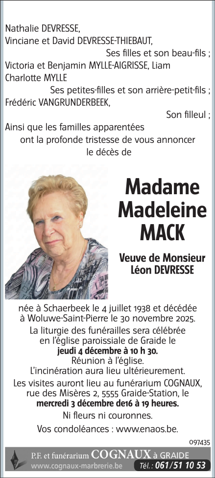 Décédée à Brussel (Sint-Pieters-Woluwe) (1150) le dimanche 30 novembre 2025 à l'âge de 87 ans