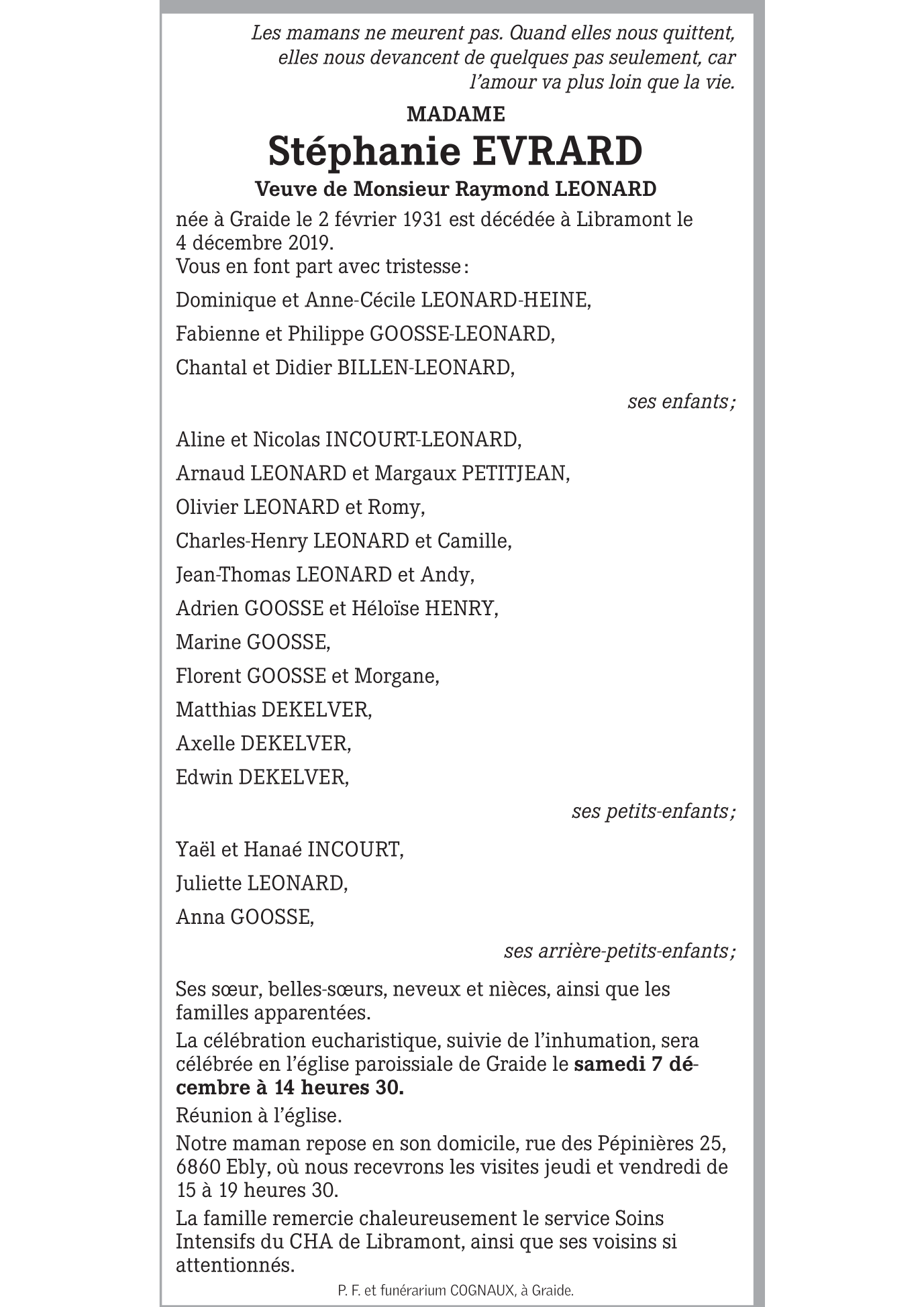 Décédée à Libramont (6800) le mercredi 4 décembre 2019 à l'âge de 88 ans