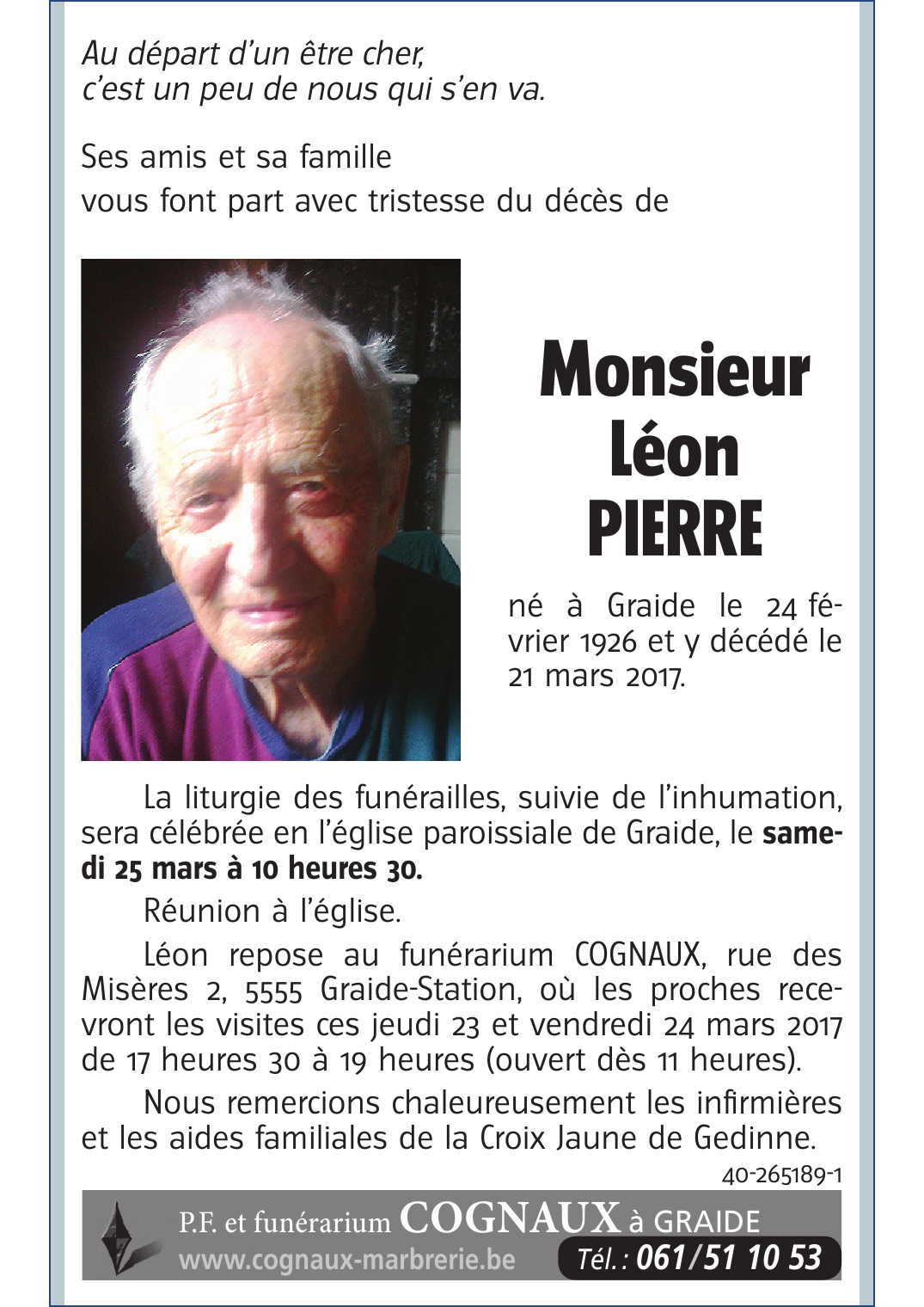 Décédé à Graide (5555) le mardi 21 mars 2017 à l'âge de 91 ans
