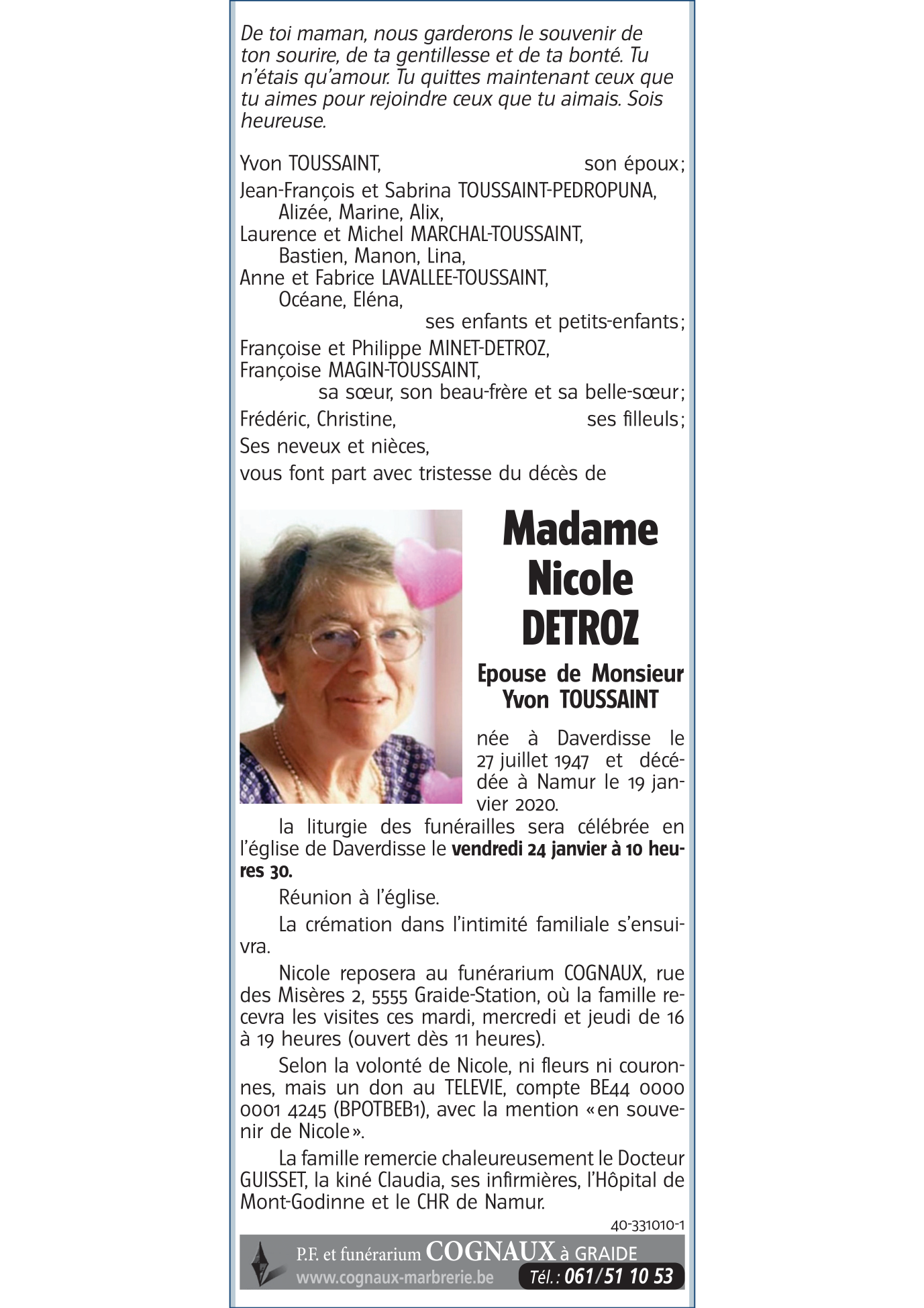 Décédée à Namur (5000) le dimanche 19 janvier 2020 à l'âge de 72 ans