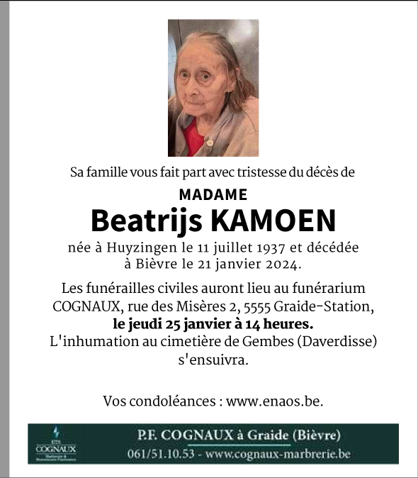 Décédée à Bievre (5555) le dimanche 21 janvier 2024 à l'âge de 86 ans