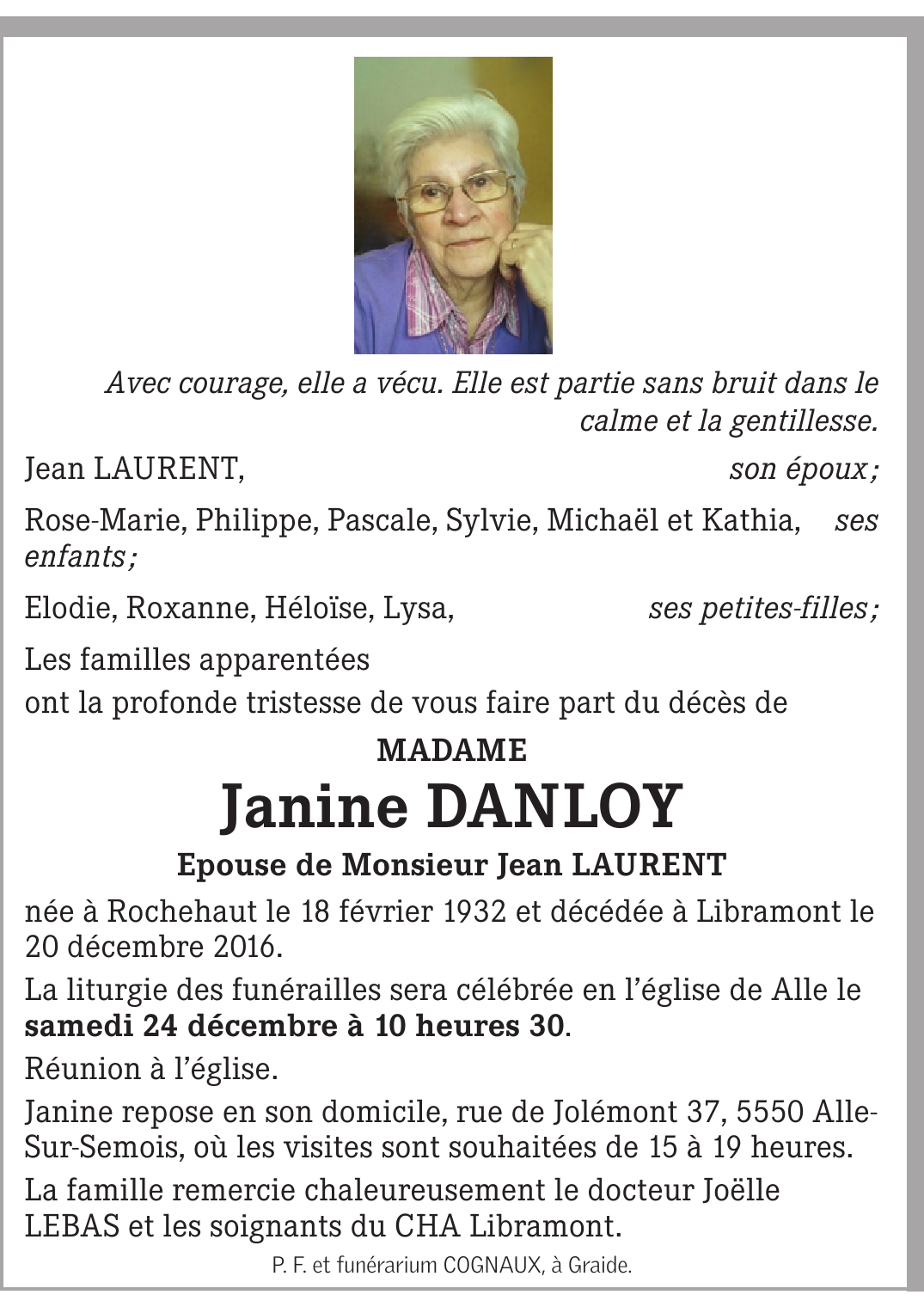 Décédée à Libramont (6800) le mardi 20 décembre 2016 à l'âge de 84 ans