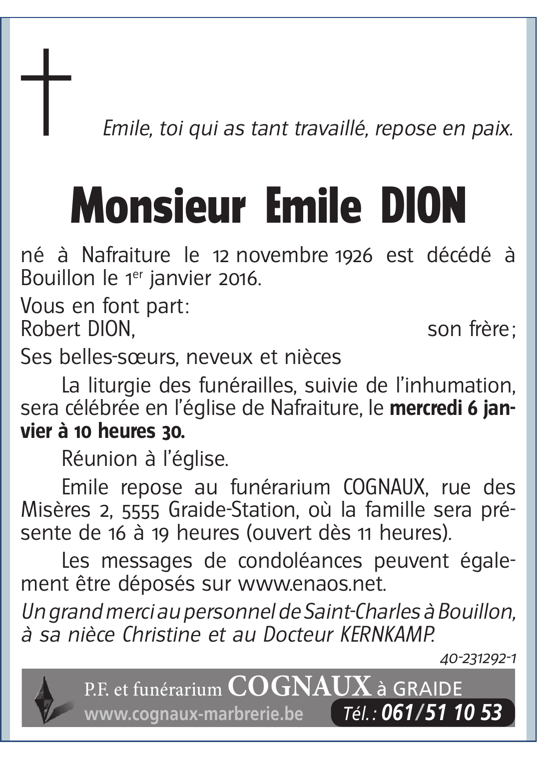 Décédé à Bouillon (5370) le vendredi 1 janvier 2016 à l'âge de 89 ans