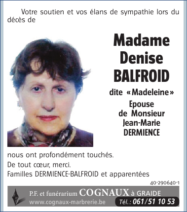 Epouse de Monsieur Jean-Marie DERMIENCE