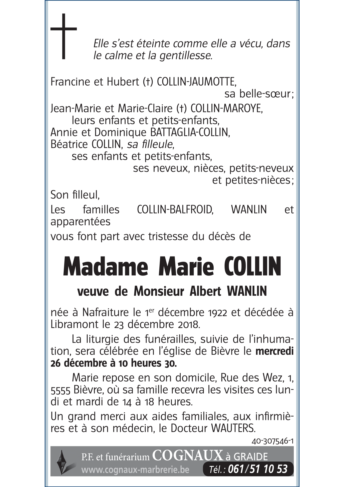 Décédée à Libramont (6800) le dimanche 23 décembre 2018 à l'âge de 96 ans
