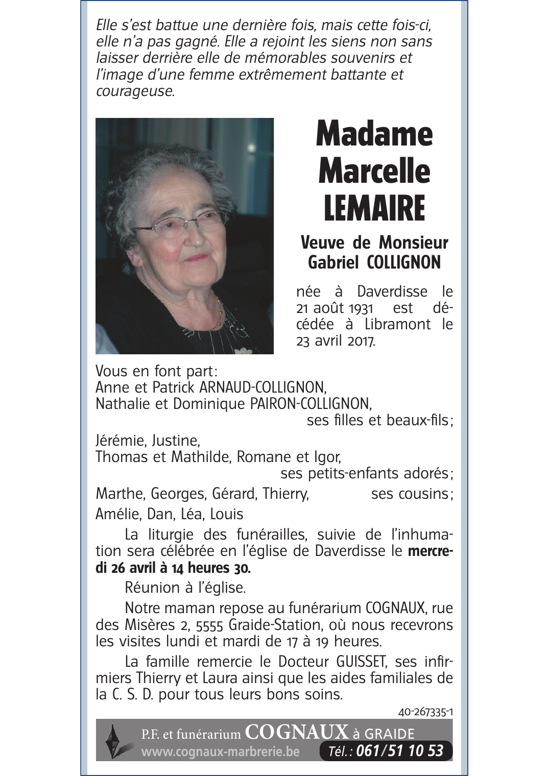 Décédée à Libramont (6800) le dimanche 23 avril 2017 à l'âge de 85 ans