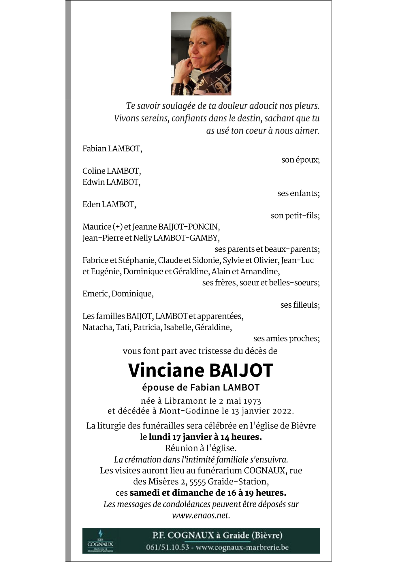 Décédée à Mont-Godinne (5530) le jeudi 13 janvier 2022 à l'âge de 48 ans