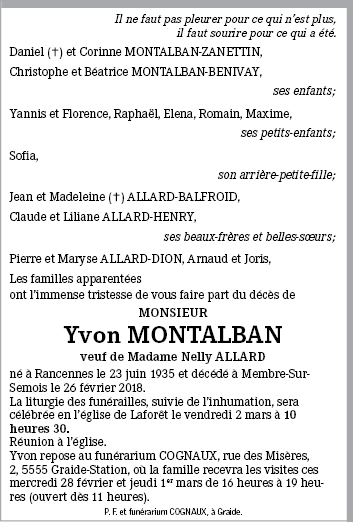 Décédé à Membre (5550) le lundi 26 février 2018 à l'âge de 82 ans