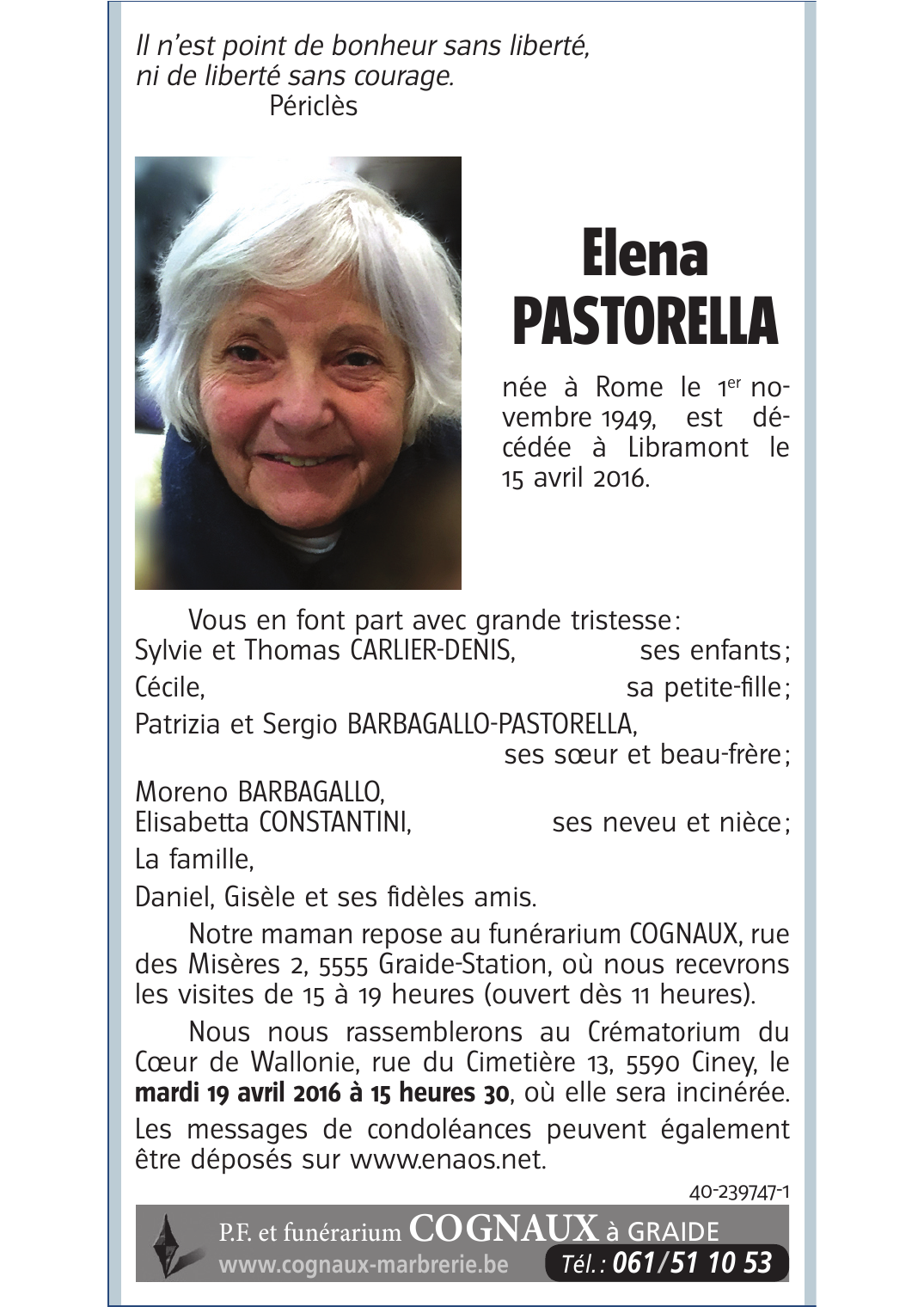 Décédée à Libramont (6800) le vendredi 15 avril 2016 à l'âge de 66 ans