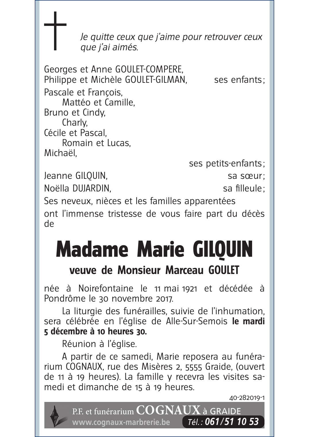 Décédée à Pondrôme (5574) le jeudi 30 novembre 2017 à l'âge de 96 ans