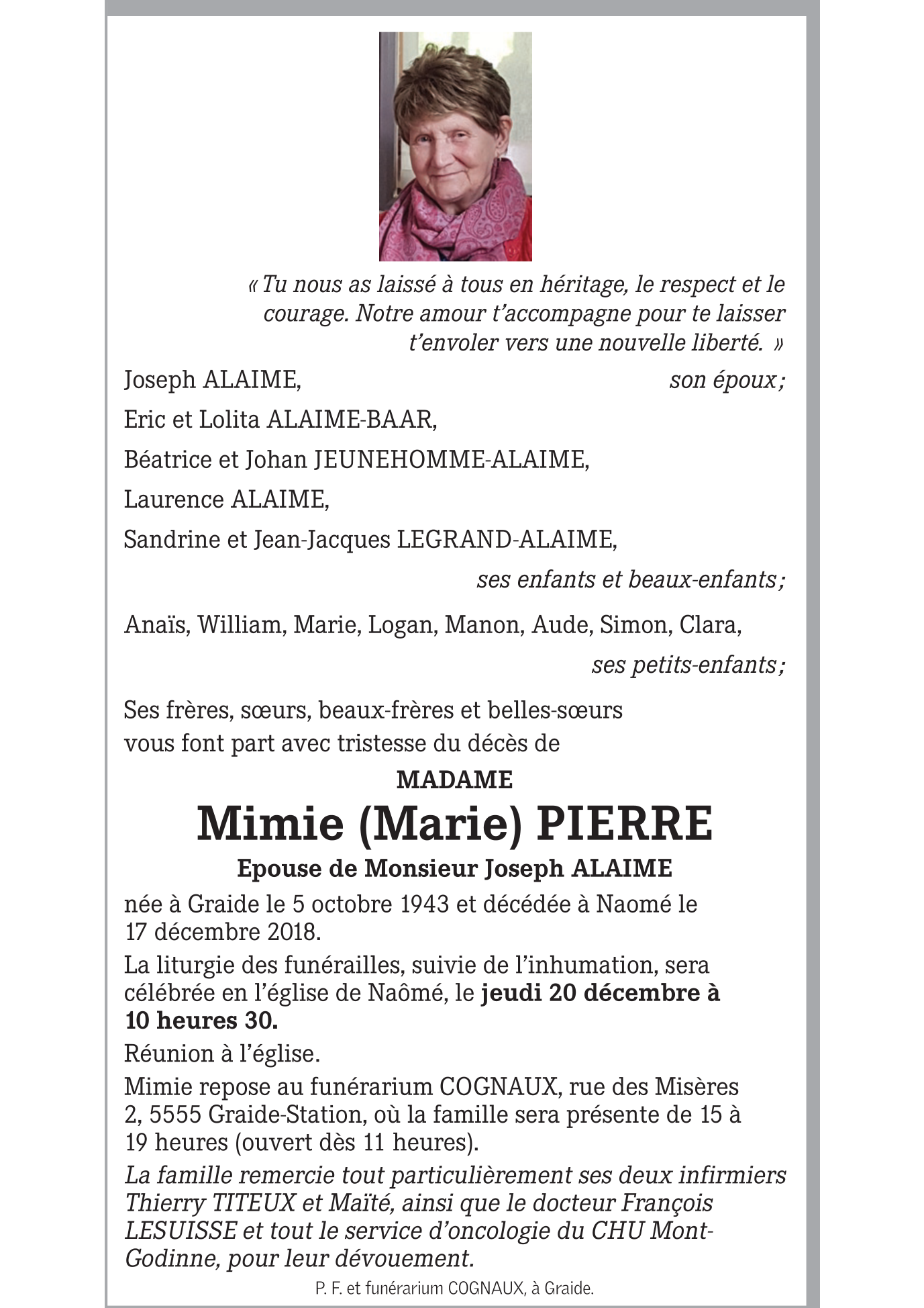 Décédée à Naomé (5555) le lundi 17 décembre 2018 à l'âge de 75 ans