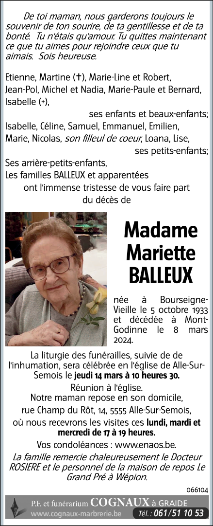 Décédée à Mont-Godinne (5530) le vendredi 8 mars 2024 à l'âge de 90 ans