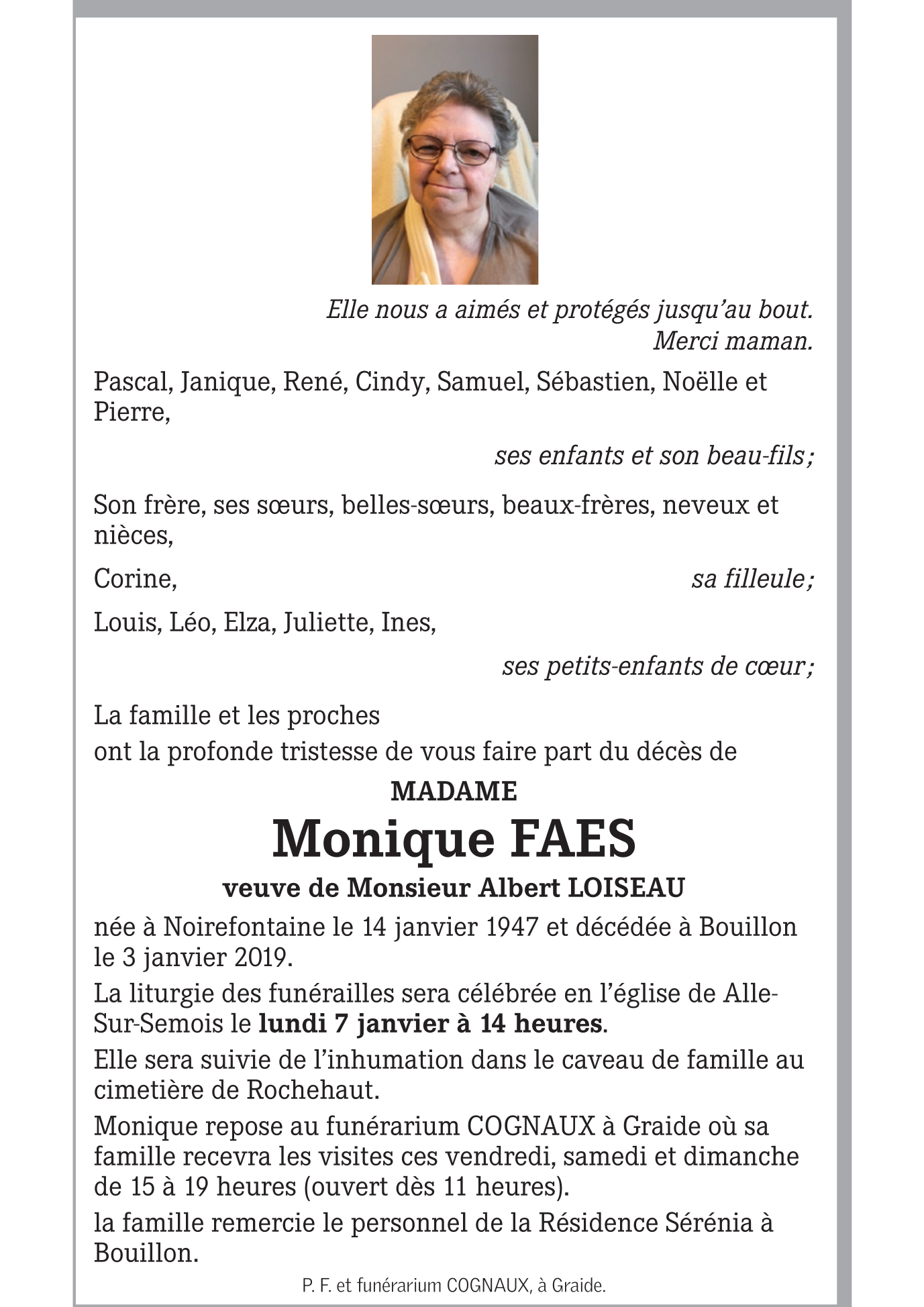 Décédée à Bouillon (6830) le jeudi 3 janvier 2019 à l'âge de 71 ans