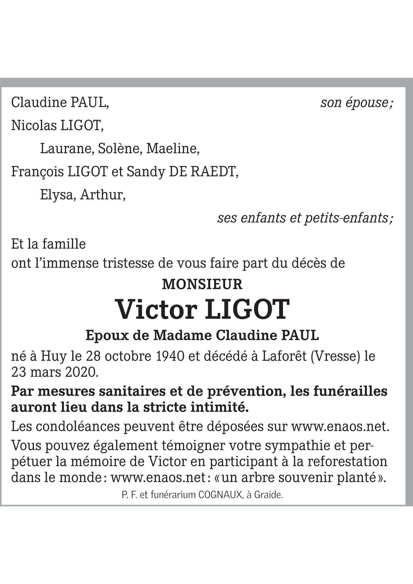 Décédé à Laforêt (5550) le lundi 23 mars 2020 à l'âge de 79 ans