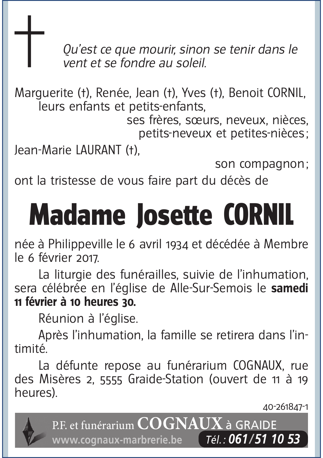 Décédée à Membre (5550) le lundi 6 février 2017 à l'âge de 82 ans