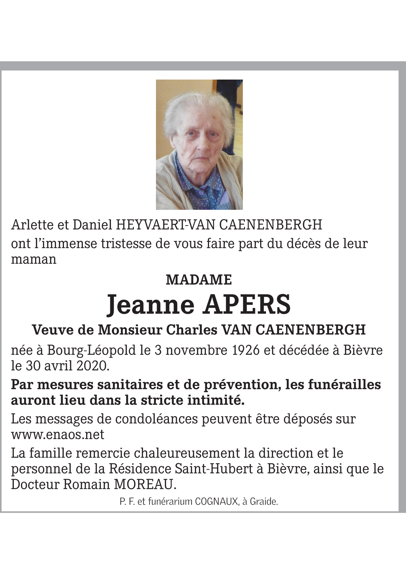 Décédée à Bievre (5555) le jeudi 30 avril 2020 à l'âge de 93 ans