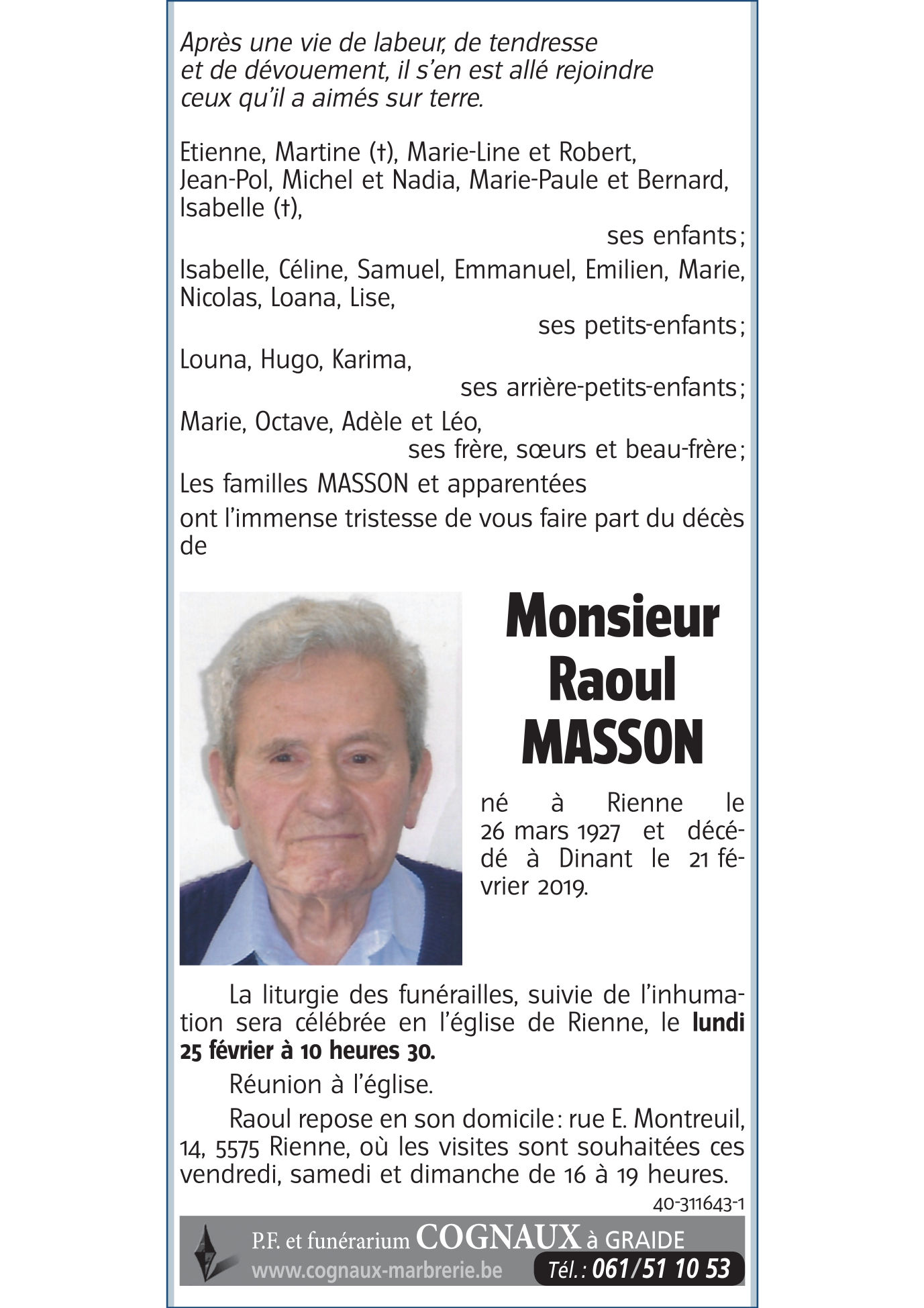 Décédé à Dinant (5500) le jeudi 21 février 2019 à l'âge de 91 ans